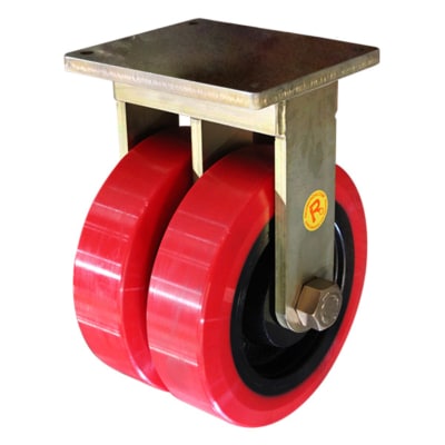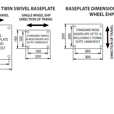 This range of castors are custom designed and manufactured here in Australia, at our Melbourne fabrication facility. This ensures that they are of the highest quality. This range can carry up to 10,00kg (10 tonne) per castor, and feature a twin wheel design for extra strength. They feature large opposed taper roller bearings in the swivel head, which allow for the castors to be power-towed at speeds of up to 12kph. The frames are robot welded, and fully sealed to ensure a long lifespan. They are available with a choice of either steel, polyurethane tyred steel centred or polyurethane tyred cast iron centred wheels. All of these wheel types are capable of withstanding the toughest conditions. They have a 200mm x 150mm baseplate, which is constructed from only the toughest materials.